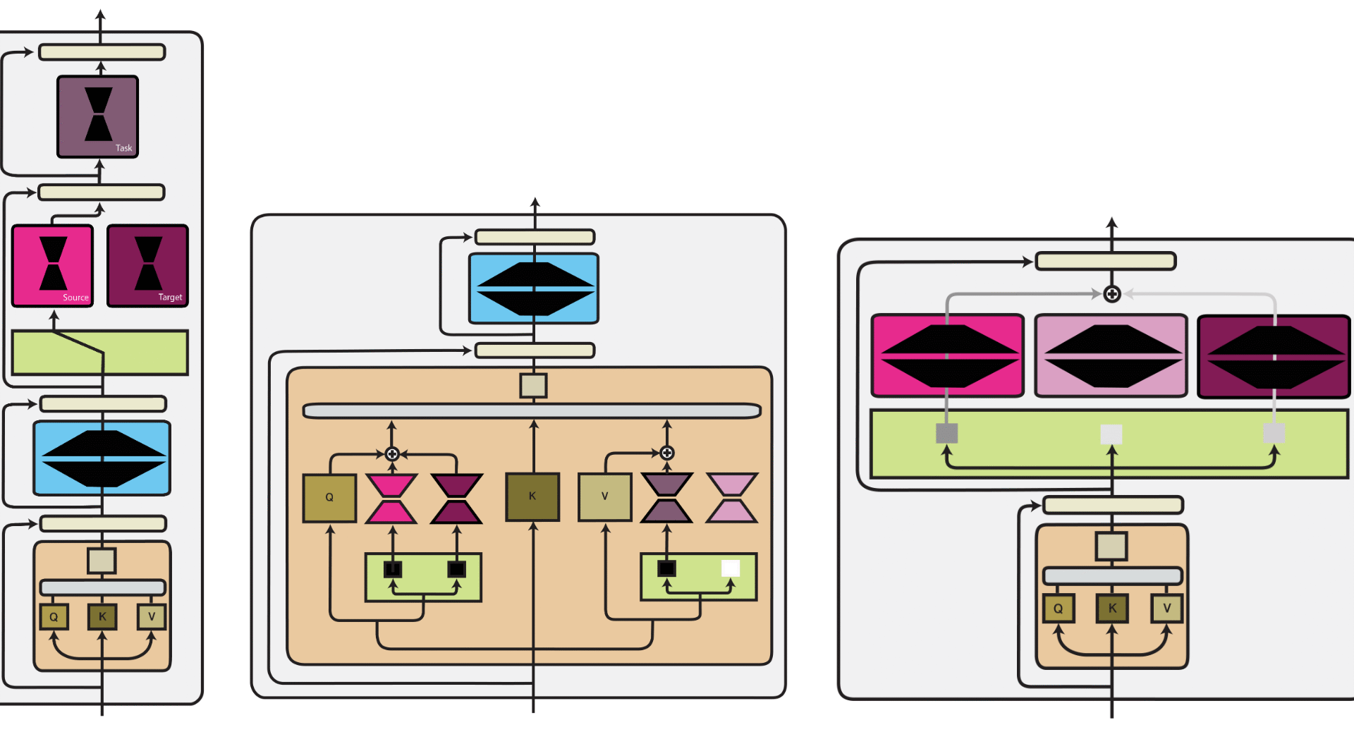 We provide an overview of the three comptuation functions (in addition to a hypernetwork) as part of a Transformer architecture below:
