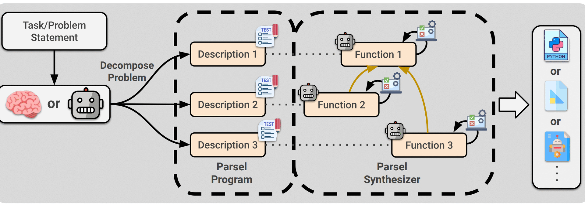 Parsel🐍: Algorithmic Reasoning with Language Models by Composing Decompositions (Zelikman et al.). This paper introduces Parsel, a framework to implement complex programs with code LLMs. An LLM is first used to generate natural language function descriptions in a simple intermediate language. For each function description, the model then generates implementation candidates. The function candidates are then tested against input-output constraints and composed to form the final program. Using GPT-4 as LLM, this framework increased performance on HumanEval from 67% to 85%. This is a great example of how LLMs can be used as a building block together with domain-specific knowledge and tools for much improved performance. In addition, expect to see more work on breaking down complex decision problems into subproblems that are more easily solvable using LLMs.