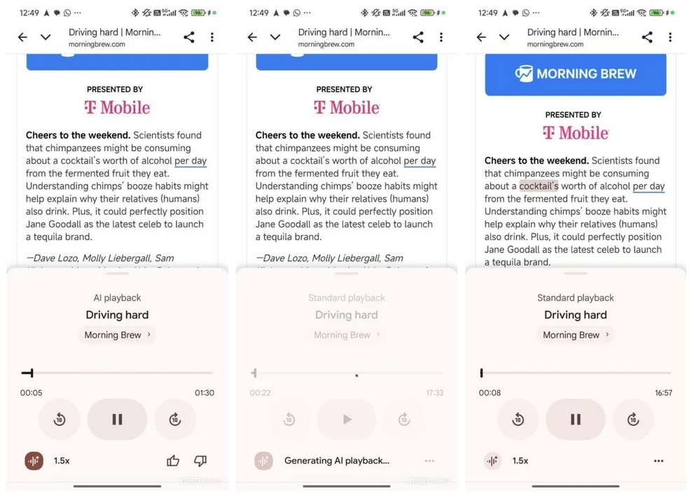 Chrome on Android already has a read aloud feature, which is basically an accessibility option. You can use it by tapping on the three-dot menu button (when on a web page), and select “Listen to this page”. But this narration is robotic, and rather boring. The same option, Listen to this page, is gaining a new button in the bottom left corner. Tapping on this button generates AI playback like a podcast featuring two AI hosts, which you can listen to, just like in NotebookLM. You can tap the button again to switch the AI playback off, and use the regular text-to-speech mode.