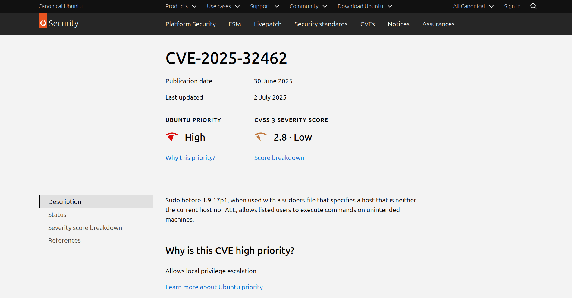 And that’s without considering how tricky managing individual CVEs can be. Take for example CVE-2025-32462: this vulnerability has a CVSS 3 Severity Score and MITRE score of just 2.8 (low); but when you look at other assessments, like the NIST NVD, it has a severity score of 8.8 (High). Our own security team rated this particular CVE as Ubuntu Priority High.