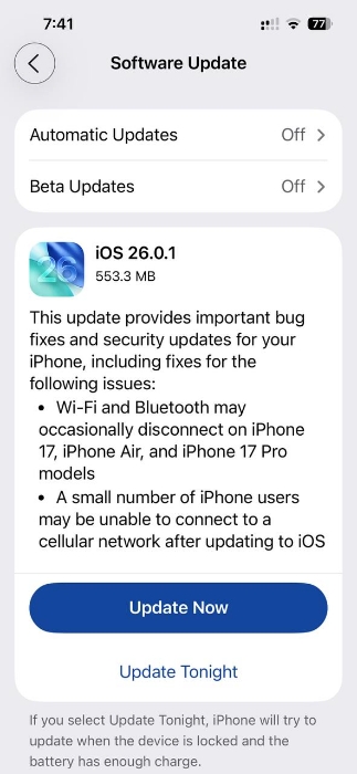 Here are the release notes from the iOS 26.0.1 update: