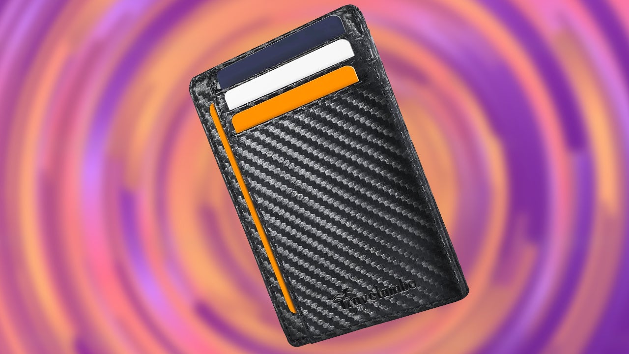 The Travelambo is a minimalist wallet that measures 3.3″ x 4.1″ and only 0.12″ thin. It’s made out of “genuine” leather, which I assume means not vegan (aka usually vinyl), and features a simulated carbon fiber weave design. It has slots for up to 6 cards, including one slot with a clear window for your photo ID. The wallet features RFID blocking technology and “has been tested for 13.56MHz frequency in which credit cards, debit cards, driver license, and ID cards operate”.