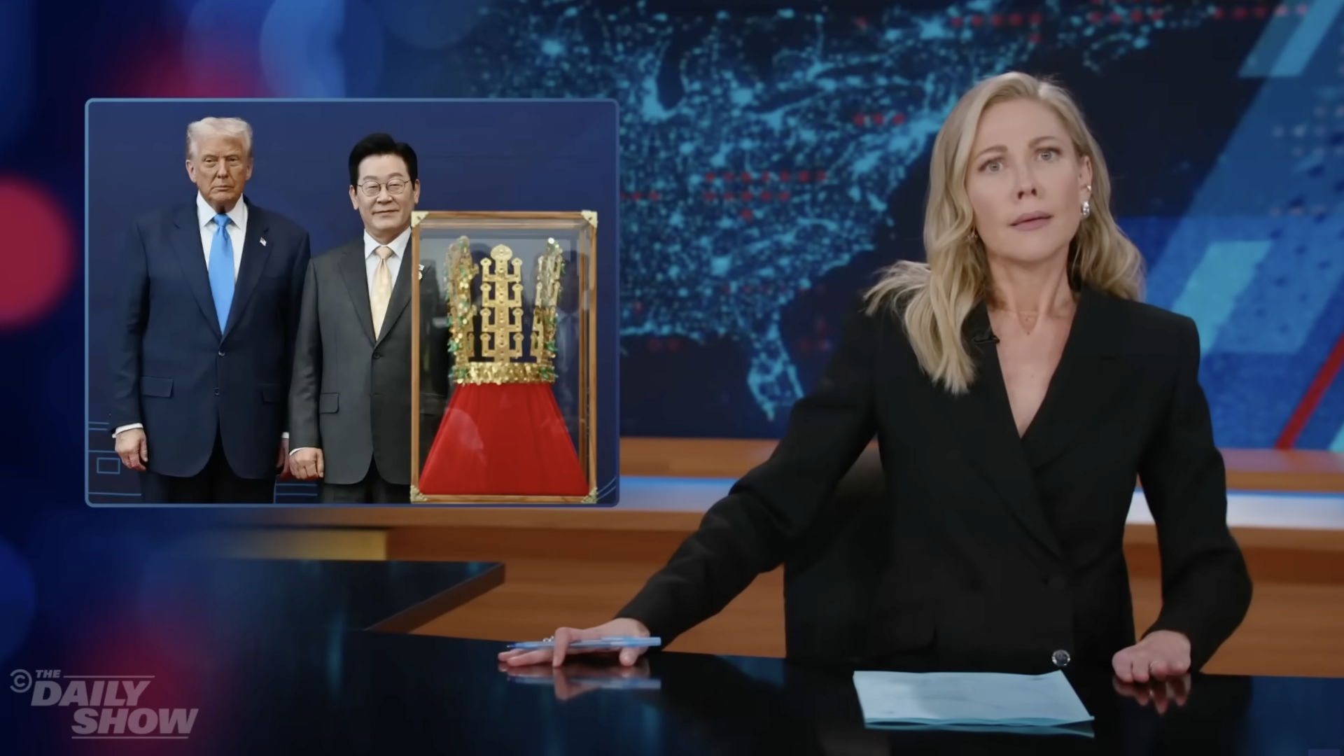 “Wow! A golden crown! What a lovely, thoughtful gift for our president. South Korea, can I just talk to you for a minute over here…” said Lydic, before directly addressing the country down the camera.