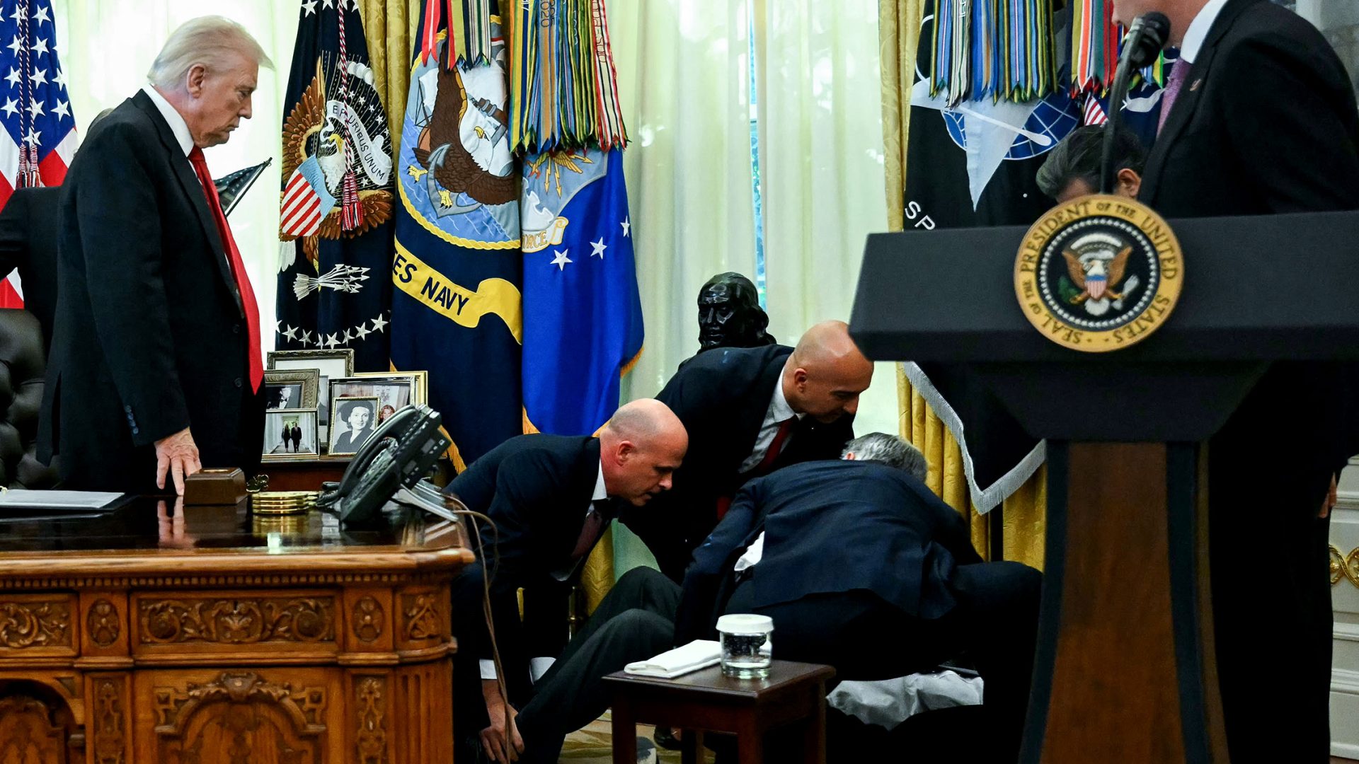 Live TV coverage of the event shows Novo Nordisk executive Gordon Findlay slumping to the floor inside the Oval Office, with several men nearby helping to guide his body safely to the ground. Medicare and Medicaid administrator Mehmet Oz grabbed Findlay under the shoulders to help him to the ground.