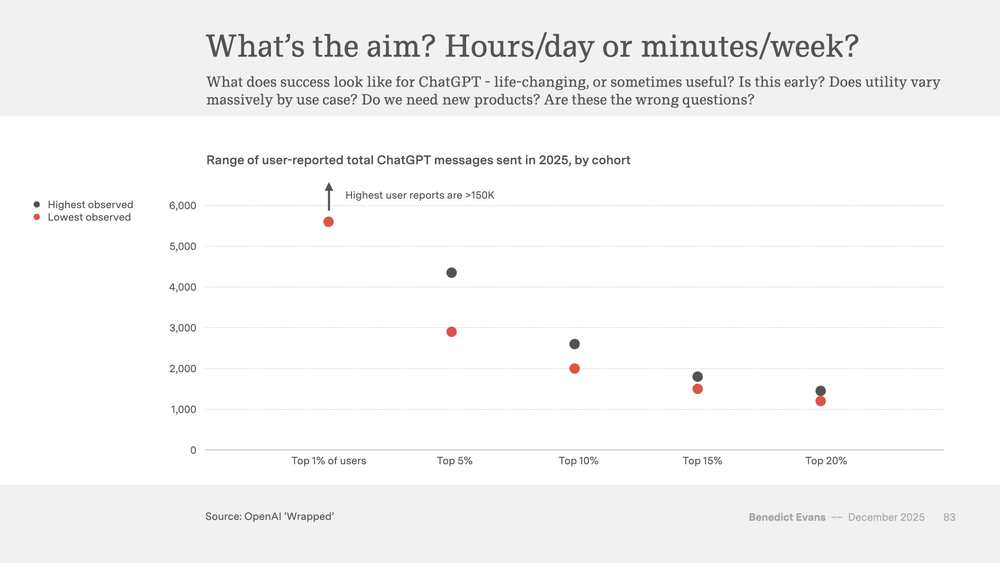 The one place where OpenAI does have a clear lead today is in the user base: it has 8-900m users. The trouble is, there’re only ‘weekly active’ users: the vast majority even of people who already know what this is and know how to use it have not made it a daily habit. Only 5% of ChatGPT users are paying, and even US teens are much more likely to use this a few times a week or less than they are to use it multiple time a day. The data that OpenAI released in its ‘2025 wrapped’ promotion tells us that 80% of users sent less than 1,000 ‘messages’ in 2025. We don’t know how that changed in the year (it probably grew) but at face value that’s an average of less than three prompts per day, and many fewer individual chats. Usage is a mile wide but an inch deep.
