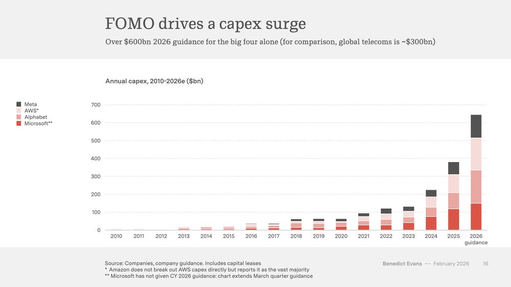 Let’s start by talking about capex. This is the stuff that gets everybody’s attention, because the tech industry has never contemplated such large numbers before. The big four cloud companies spent about $400 billion on infrastructure last year and have announced plans for at least $650 billion this year.