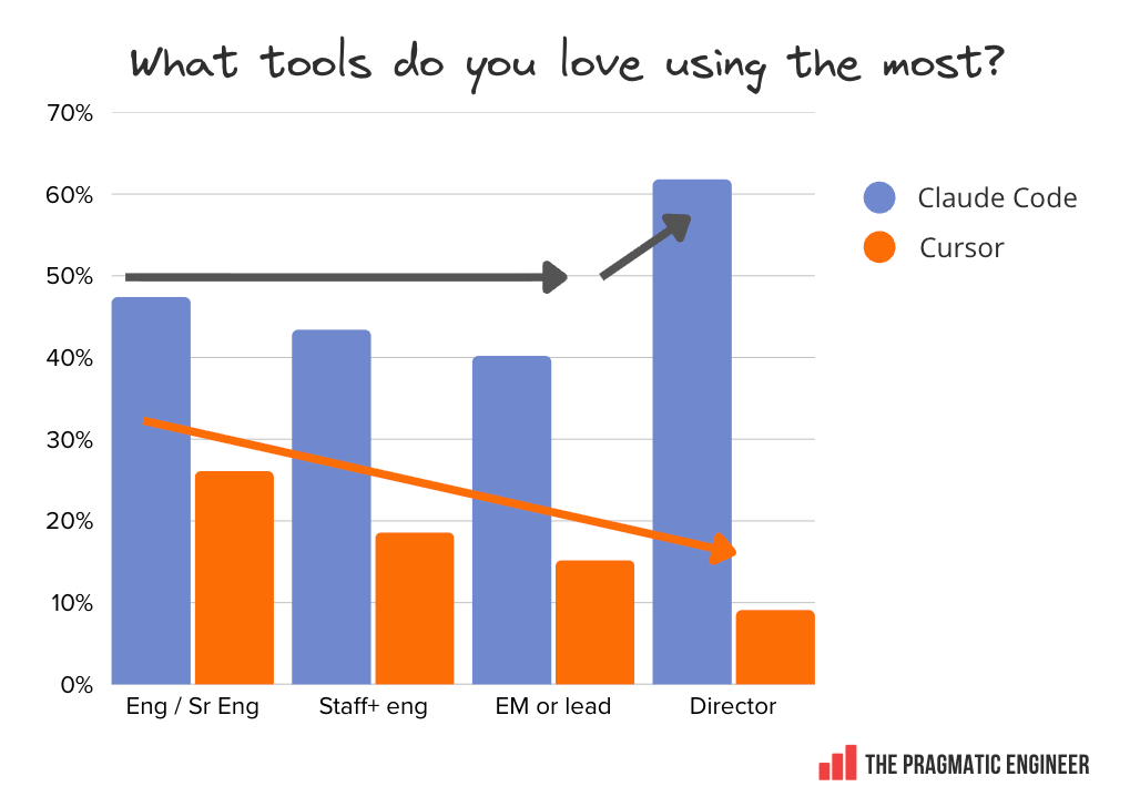 Directors and senior leaders are especially into Claude Code. The survey finds this tool is twice as popular with these folks as it is at less senior levels, while Cursor gets less love as seniority increases.