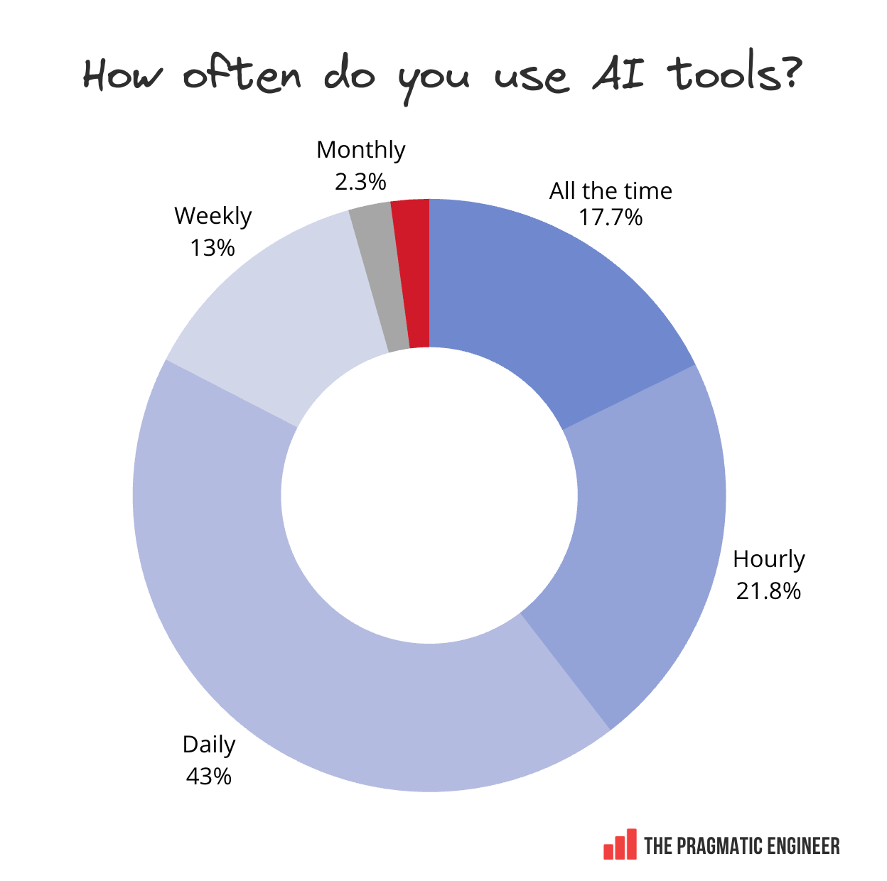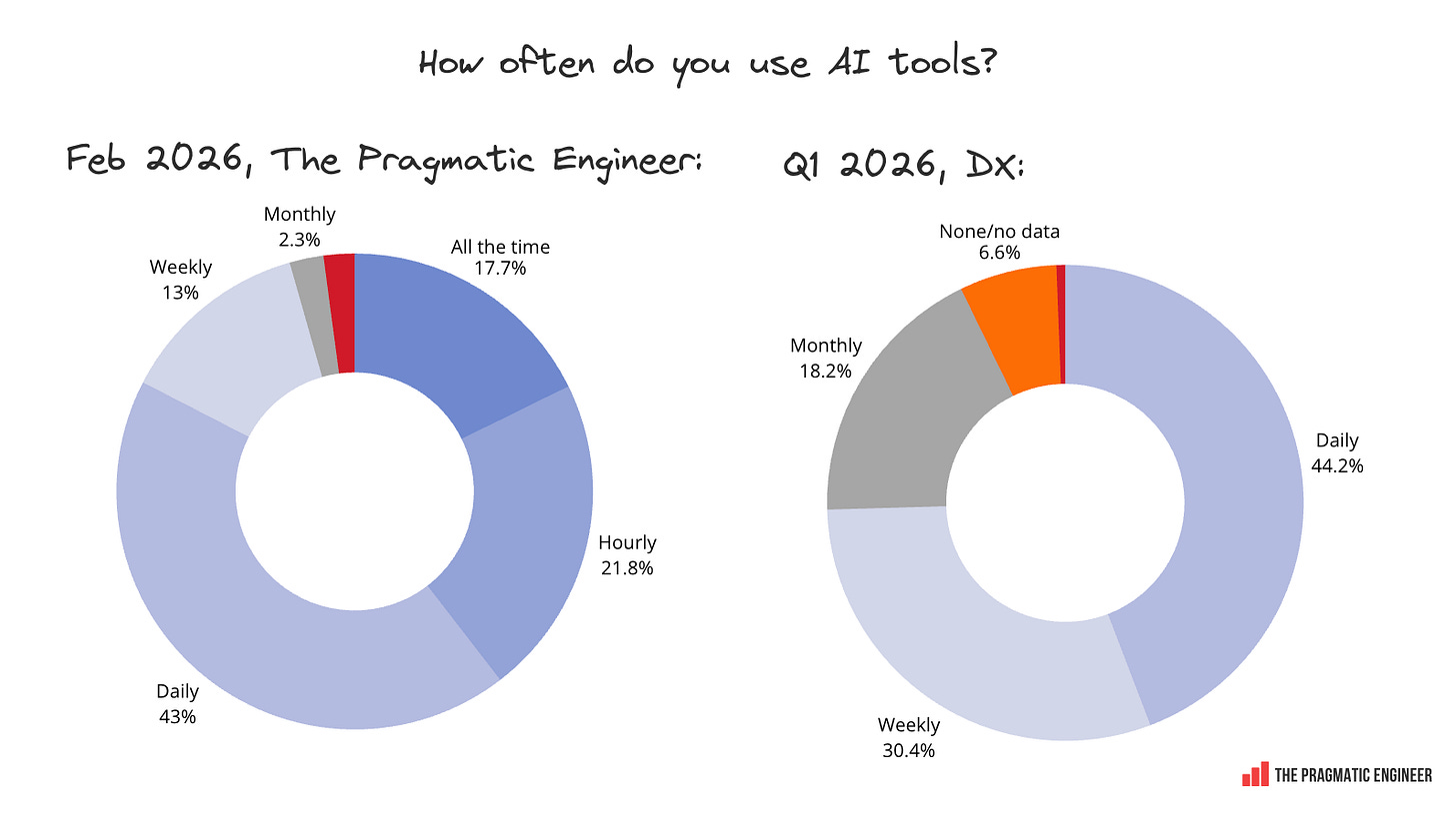 AI is now mainstream. 95% of respondents use AI tools at least weekly, or more often, and 75% use AI for at least half their software engineering work. Among readers of The Pragmatic Engineer, it seems the question is no longer whether to use AI in day-to-day work, but which tools to use.
