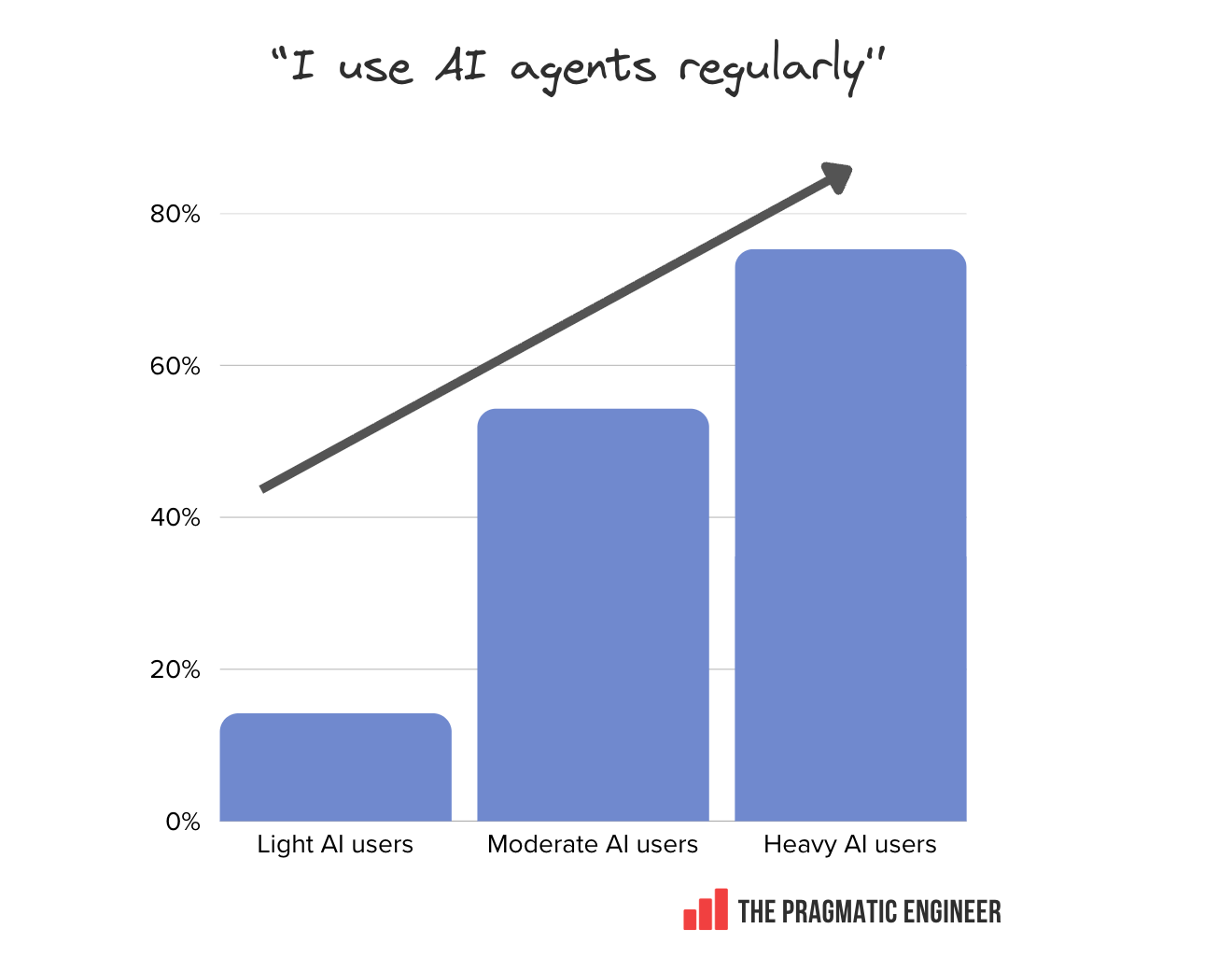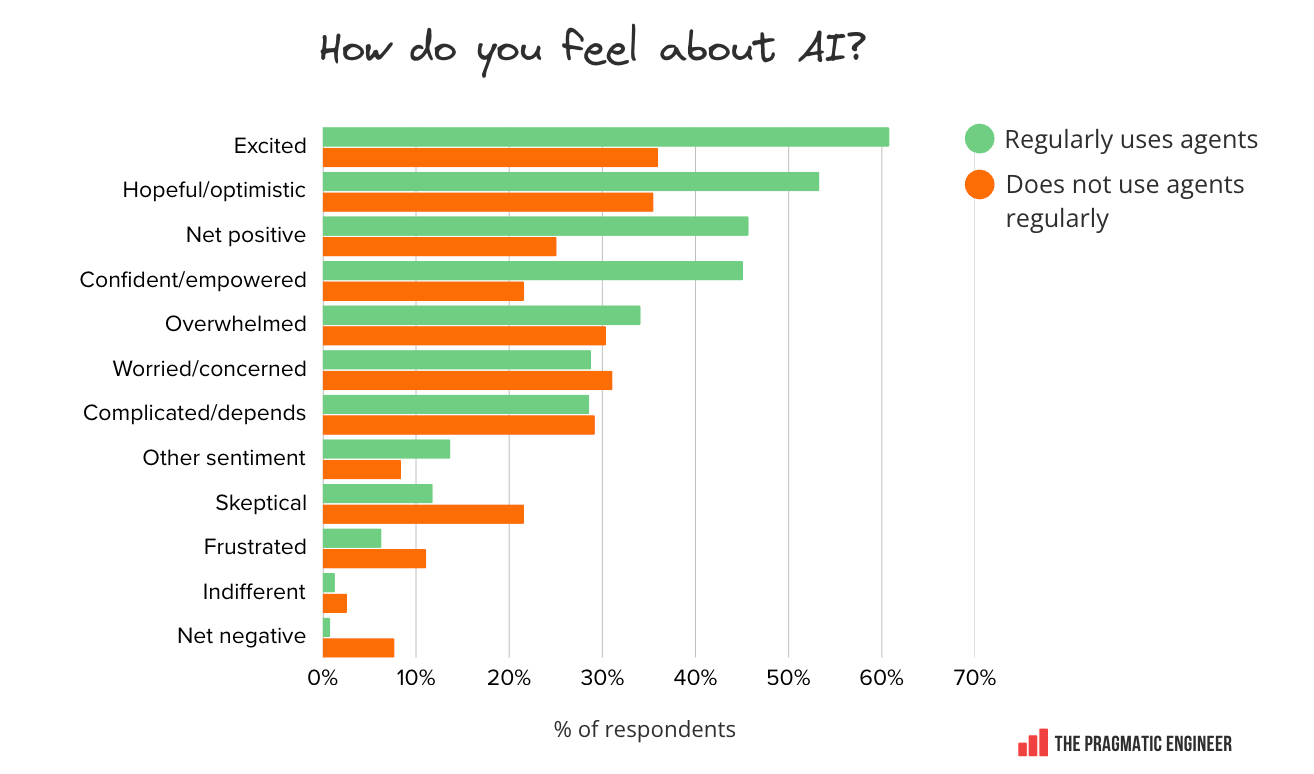 AI agent usage rising: 55% of respondents now regularly use AI agents, with staff+ engineers leading adoption on 63.5% usage in the survey results. Agent users are twice as excited about AI as non-users are.