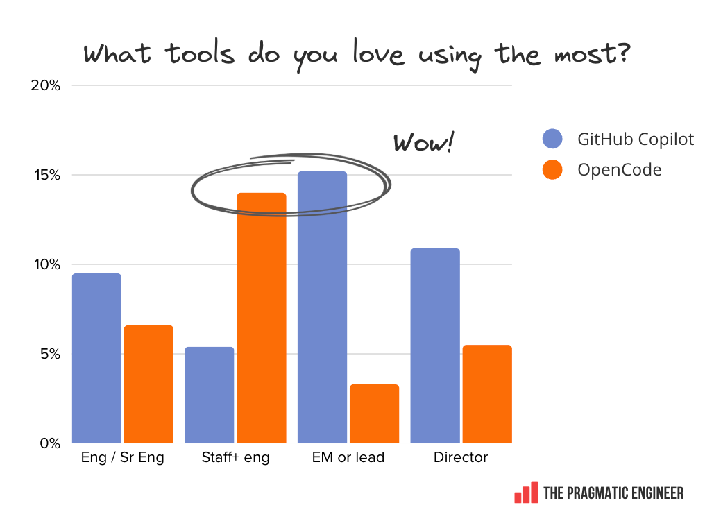 Both OpenCode and GitHub Copilot are surprisingly loved by Staff+ engineers. Another unexpected detail is that, despite OpenCode being used about a quarter as much as GitHub Copilot, it rivals the “loved” mentions. For Staff+ engineers, it matches GitHub on those terms: