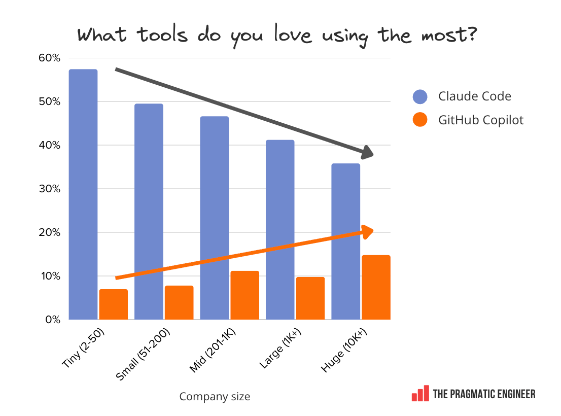 GitHub Copilot sees the opposite trajectory: it’s more loved within larger companies where it’s likely to be harder to experiment with alternatives.
