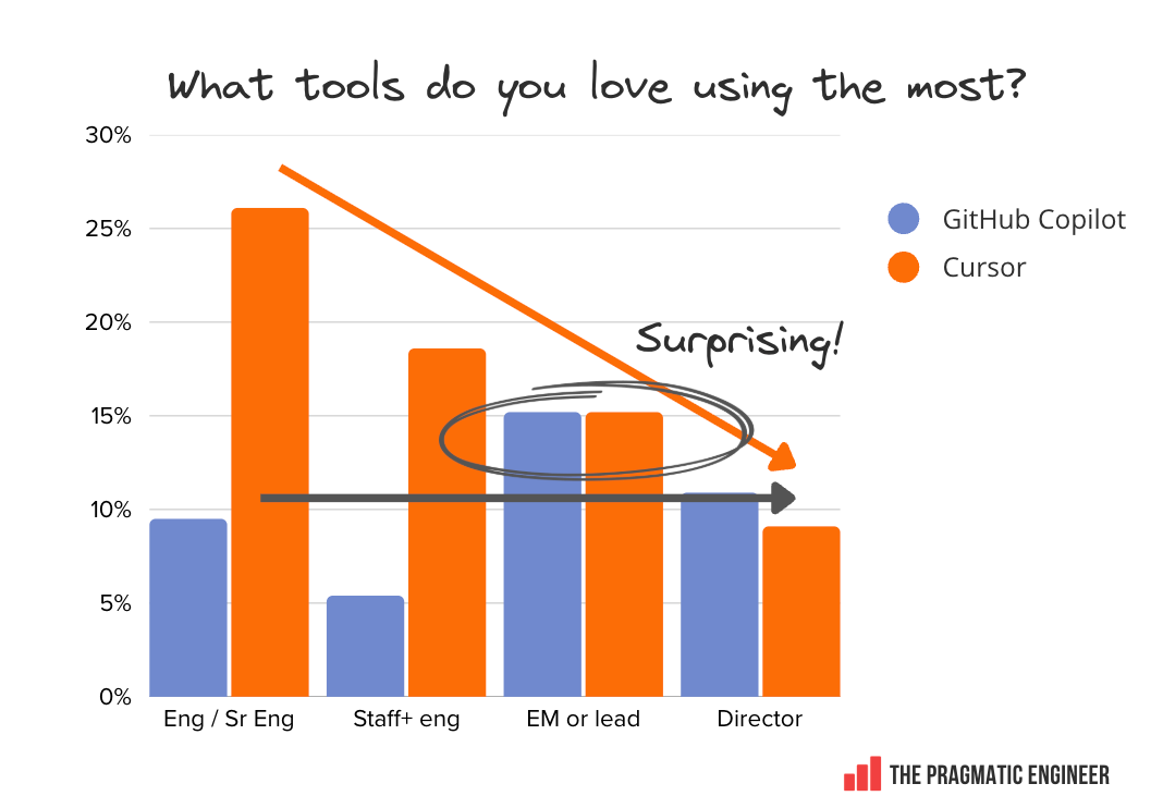 Both Claude Code and Cursor become less loved – or used! – as seniority goes up, but it’s notable that folks in senior engineering leadership positions are obsessed with Claude Code, but not Cursor.