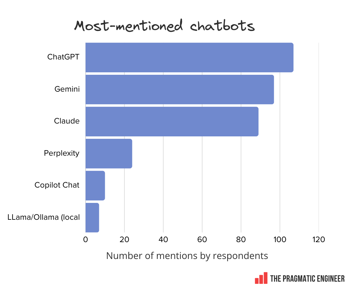 A tight chatbot race. ChatGPT, Gemini, and Claude as standalone chatbots have nearly equal numbers of mentions, suggesting there’s no clear winner outside of coding-specific tools among software engineers.