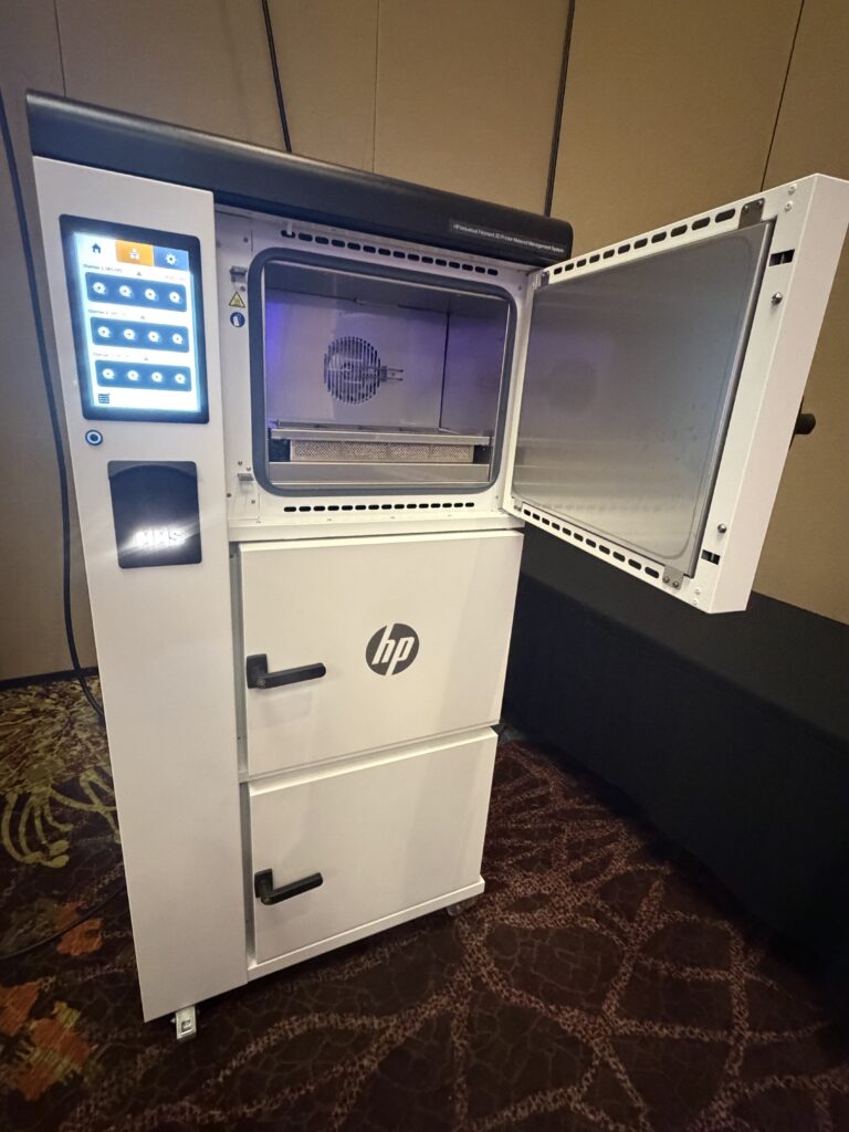 I spoke to Eric DuPaul, HP Additive Manufacturing Category Manager, at AMUG to learn more about the system. DuPaul’s job is managing the product within the region, so he’s helping to launch the HP IF 600HT, and the 12-filament Material Management System (MMS) that goes with it, in the Americas.